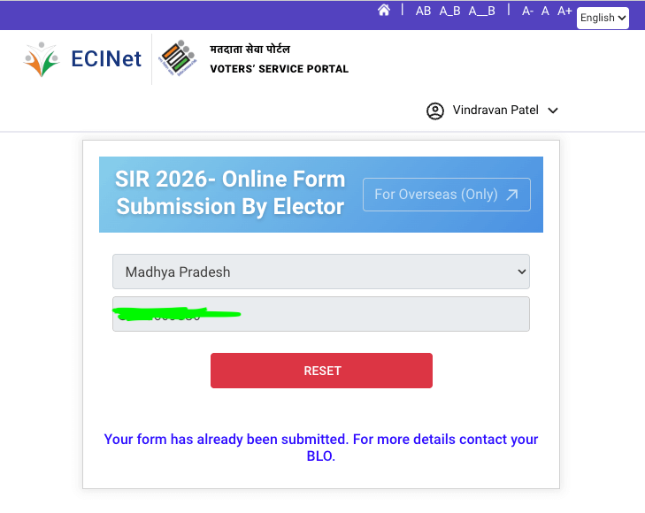 - अब अगर BLO ने आपका फॉर्म ऑनलाइन सबमिट किया हैं, तब कुछ इस तरह के मेसेज शो होगा ( Your form has already been submitted. For more details contact your BLO )